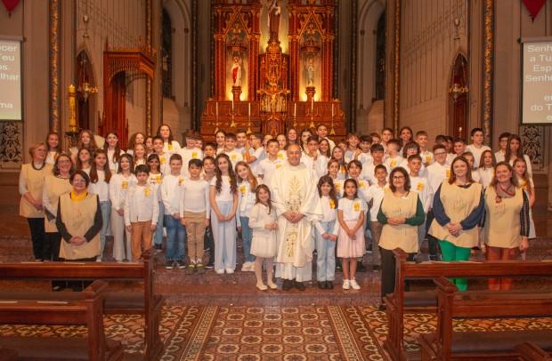 A Catedral Diocesana de Caxias do Sul - Paróquia Santa Teresa D'Ávila ficou lotada em dois momentos, na tarde do sábado, 19 de outubro, para as celebrações da Primeira Eucaristia de 94 crianças, às 16h e 19h. Após a liturgia da Palavra, os catequizandos professam sua fé com a oração do Creio e, no momento da comunhão, recebem o Sacramento da Eucaristia.