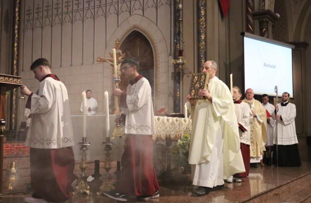 Logo depois foi proclamada a Páscoa com o canto do Exultet, seguido da Liturgia da Palavra. Após o Evangelho e a homilia aconteceu a bênção da água, a renovação das promessas do Batismo e a aspersão sobre os fiéis. Com a Liturgia Eucarística, o povo de Deus deu graças ao Senhor por esta Páscoa. A Missa foi concelebrada pelo pároco da Catedral, padre Volnei Junior Vanassi, tendo como cerimoniário o padre Tiago Camozzato.