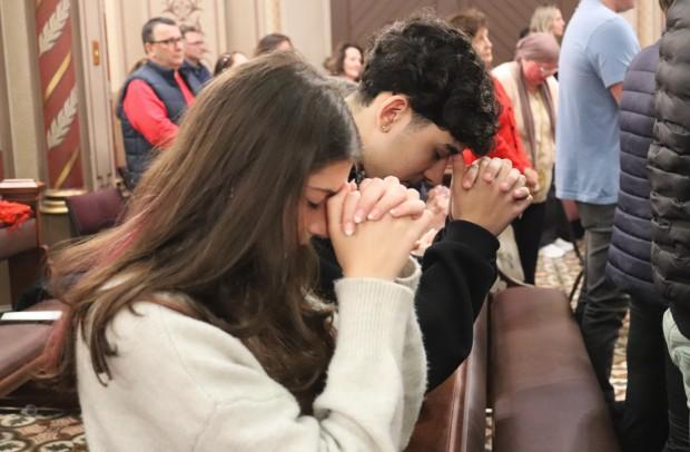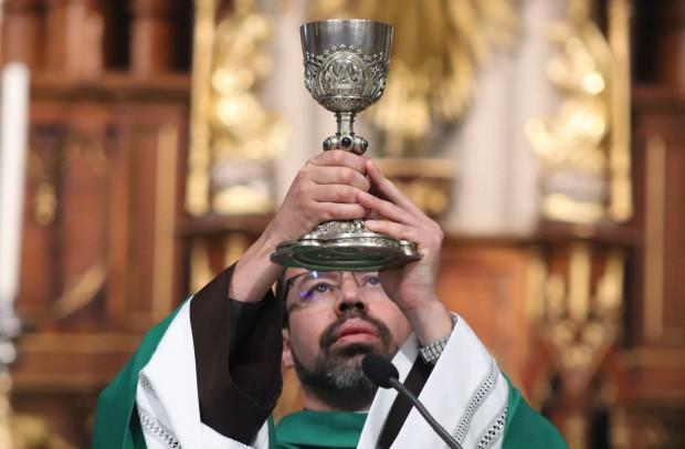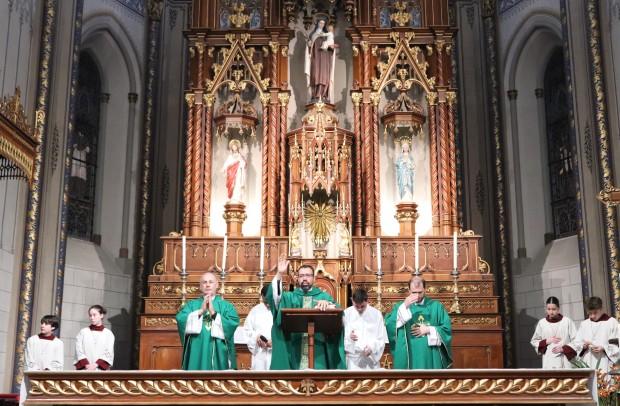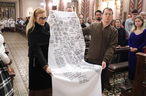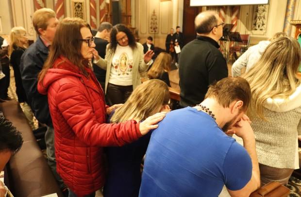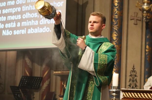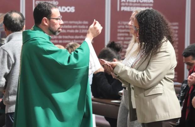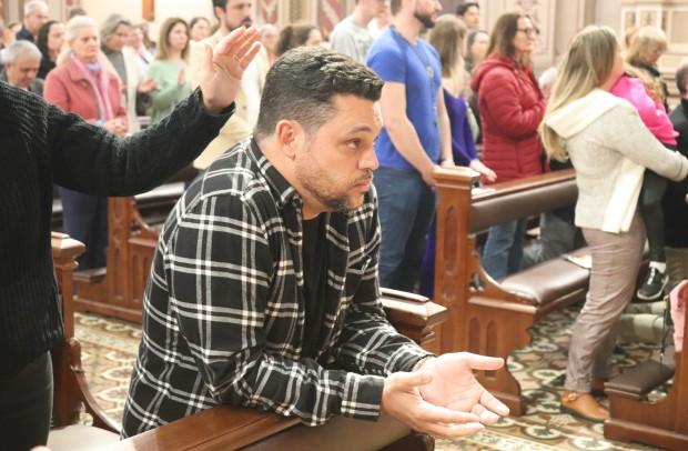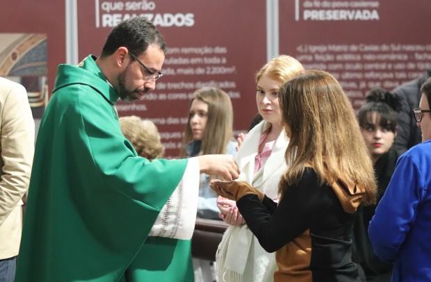 Logo depois, às 19h, com a igreja lotada, foi celebrada a Missa que abriu o tríduo dos festejos. A Eucaristia foi presidida por frei Everton e concelebrada pelos padres da Catedral, Volnei Vanassi e Tiago Camozzato. O diácono Eduardo Cantelli também participou deste momento de abertura da programação em honra a Santa Teresa. Logo no início, atrás da imagem da Padroeira de Caxias, a equipe da Pastoral Familiar entrou em procissão carregando tecidos com os nomes das famílias e os colocou diante da Cruz do Jubileu.