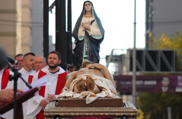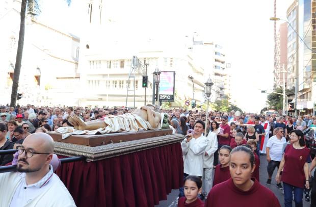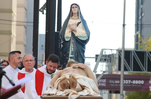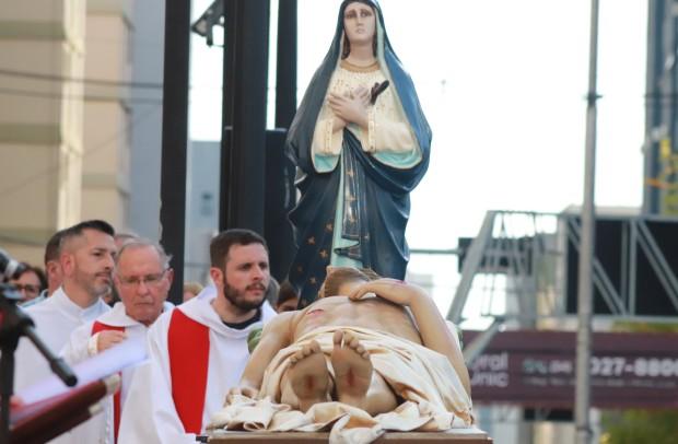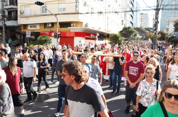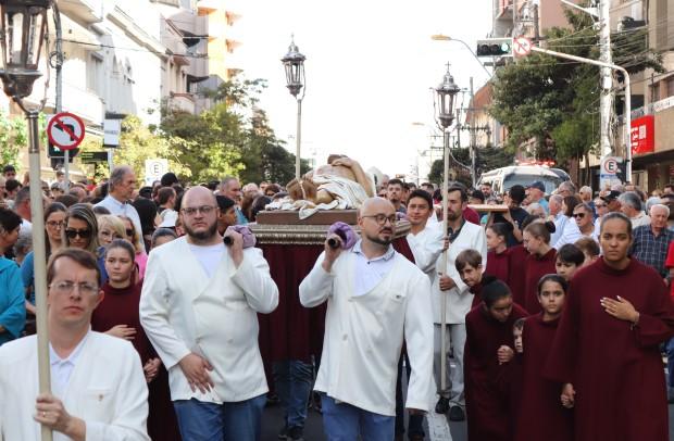 As paróquias da área central de Caxias do Sul realizaram a procissão da Sexta-feira da Paixão, neste dia 18 de abril. Fiéis partiram de quatro paróquias da cidade e da Catedral Diocesana. Mais de 8 mil pessoas rezaram no ato que teve o momento marcante do encontro das imagens do Cristo Morto, da Catedral Diocesana Santa Teresa D’Ávila e de Nossa Senhora das Dores, que chegava da capela Santo Sepulcro e da Paróquia de Lourdes.