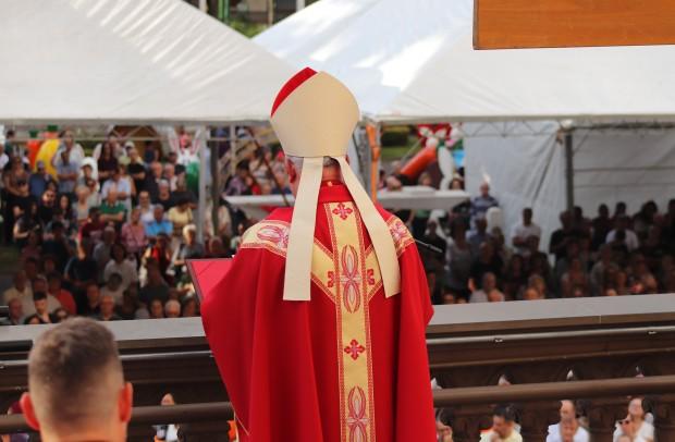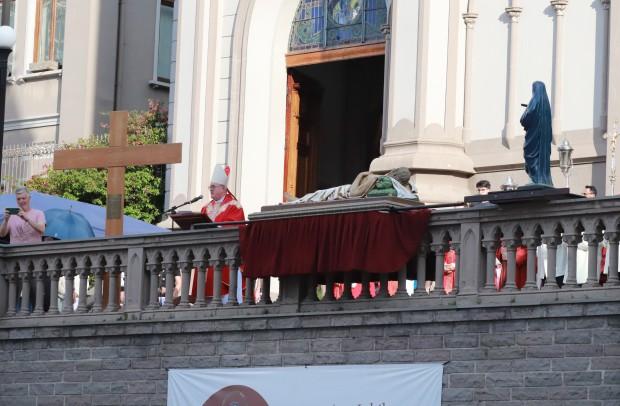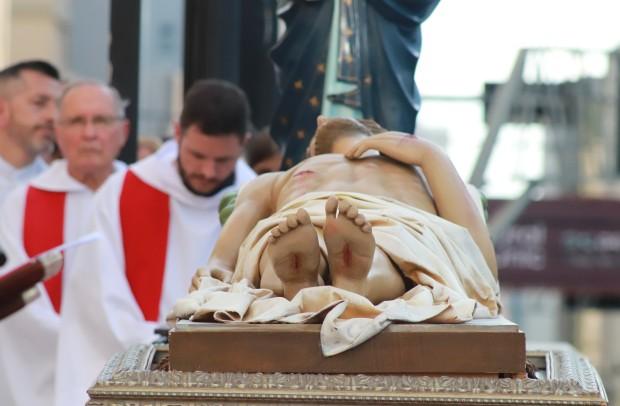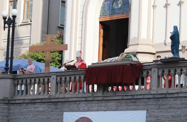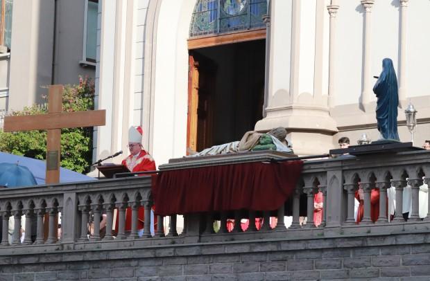 Logo depois, com as mãos estendidas, Dom José proferiu Oração sobre o Povo, concluída com a entrada das imagens do Cristo Morto e de Nossa Senhora das Dores para o interior da Catedral, para que os fiéis pudessem realizar o beijo.
