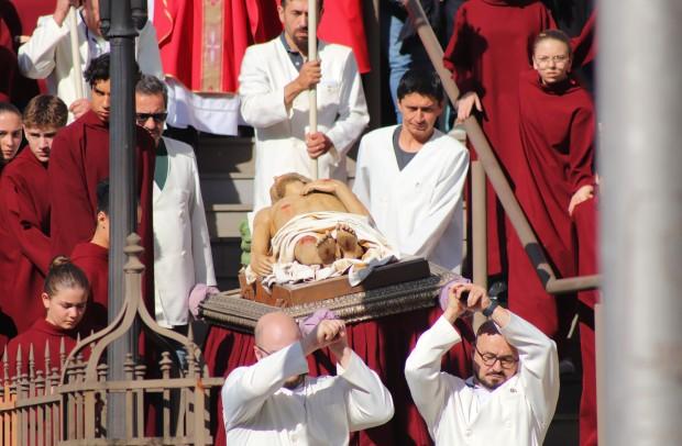 A desvelação e o beijo da Cruz também marcaram a celebração da Paixão, que contou com a prece universal, que consiste em diversas invocações ao Senhor para que olhe pela humanidade, por todos os povos, pelos que creem, pelos que não creem, pelos povos que estão em guerra, pelos governantes, dentre outros. Após a distribuição da Eucaristia, teve início a procissão com o Cristo Morto.