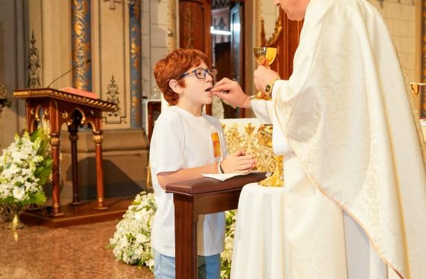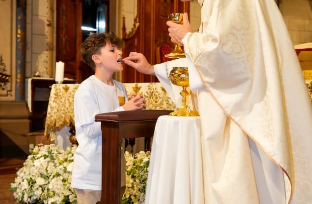 O Sacramento da Eucaristia faz parte do itinerário catequético e é um dos passos da Iniciação à Vida Cristã. Após dois anos de preparação e aprendizado sobre a pessoa de Jesus Cristo, sua vida e missão, professam a fé e recebem a Hóstia consagrada que se tornou o Corpo do Senhor no rito da consagração feito pelo sacerdote.