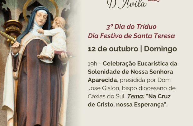 Finalmente, na quarta-feira, 15 de outubro, a cidade celebra o Dia de Santa Teresa, padroeira de Caxias do Sul. A programação vai se estender ao longo do dia, iniciando com a Bênção dos Padres nas escadarias da Catedral Diocesana, das 10h às 17h. Às 19h, o pároco da Catedral, padre Volnei Vanassi, irá presidir a Missa com bênção aos professores e a participação especial do Coral Santa Teresa, encerrando os festejos.