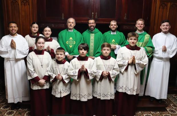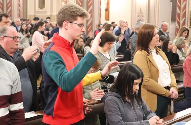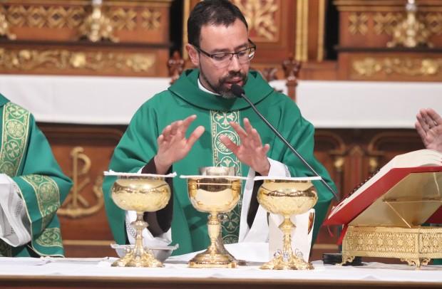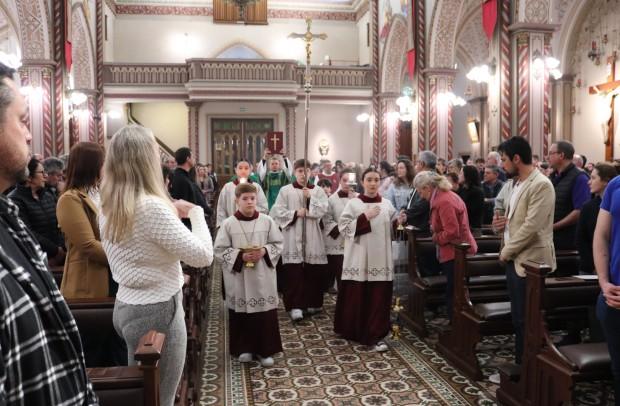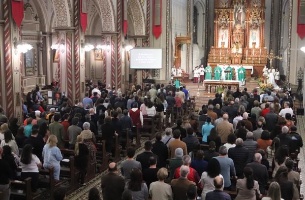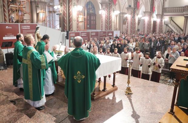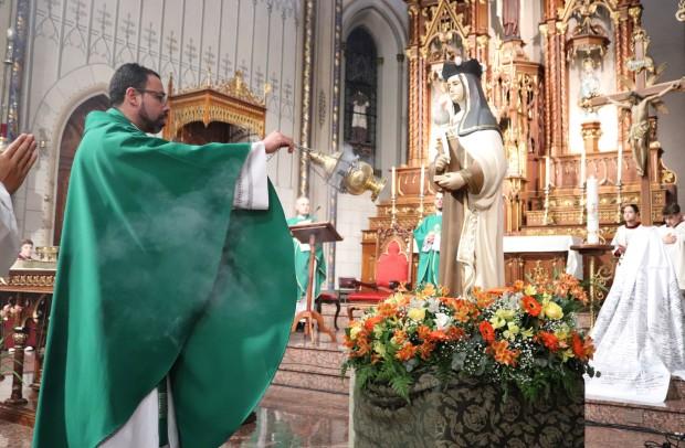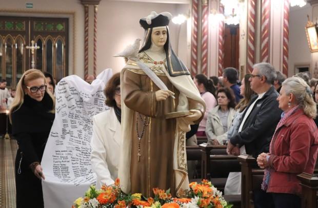 Logo depois, às 19h, com a igreja lotada, foi celebrada a Missa que abriu o tríduo dos festejos. A Eucaristia foi presidida por frei Everton e concelebrada pelos padres da Catedral, Volnei Vanassi e Tiago Camozzato. O diácono Eduardo Cantelli também participou deste momento de abertura da programação em honra a Santa Teresa. Logo no início, atrás da imagem da Padroeira de Caxias, a equipe da Pastoral Familiar entrou em procissão carregando tecidos com os nomes das famílias e os colocou diante da Cruz do Jubileu.